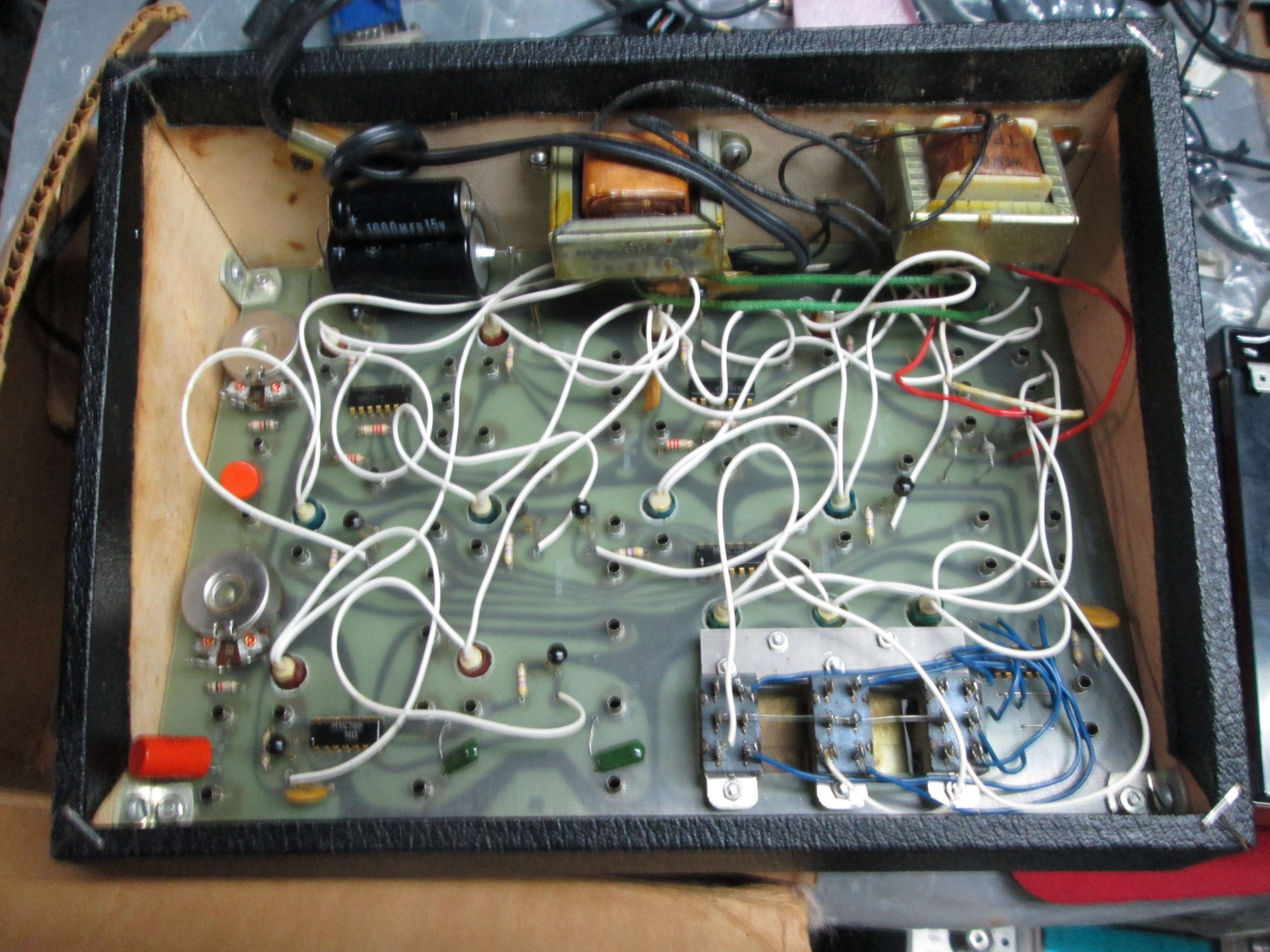 Meanwhile I inpected the case and interior. This photo of the inner corner shows many features. The case is some kind of cheap grained wood, not pressboard. Note the IC is an MC789P with datecode "7011", that is 1970 and week 11 (March). Another chip has a datecode 1970 and week 35. Those are close to the March 1970 publication date of the Popular Electronics article which introduced the product, as available from SouthWest Technical Products. This model I have, has the PE logo. Many SWTPC products of course have the STWPC logo.