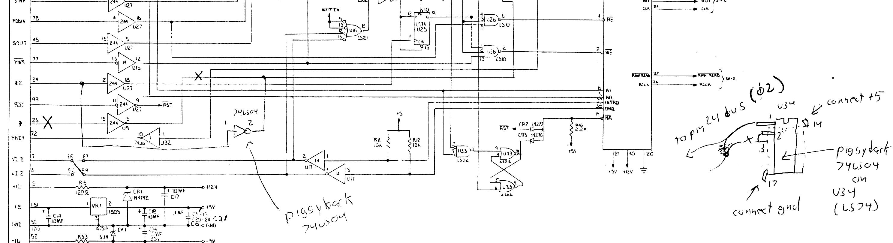 I simply solder a 74LS04 (Hex inverter IC) on a convenient chip (U34, a 74LS74) for power and ground (pins 7 and 14) and wire tie a convenient inverter to the appropriate lines. Specifically: place the 04 chip on top of the 74LS74; only solder pins 7 and 14 from the 04 to the 74; bend the other '04 pins OUT OF CONTACT. Unused pins could be cut, this modification uses pins 1 and 2.