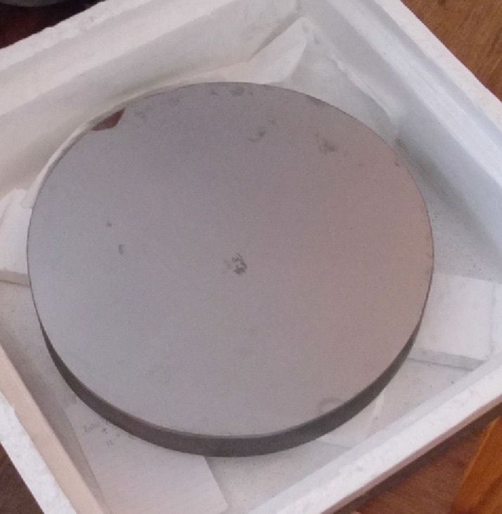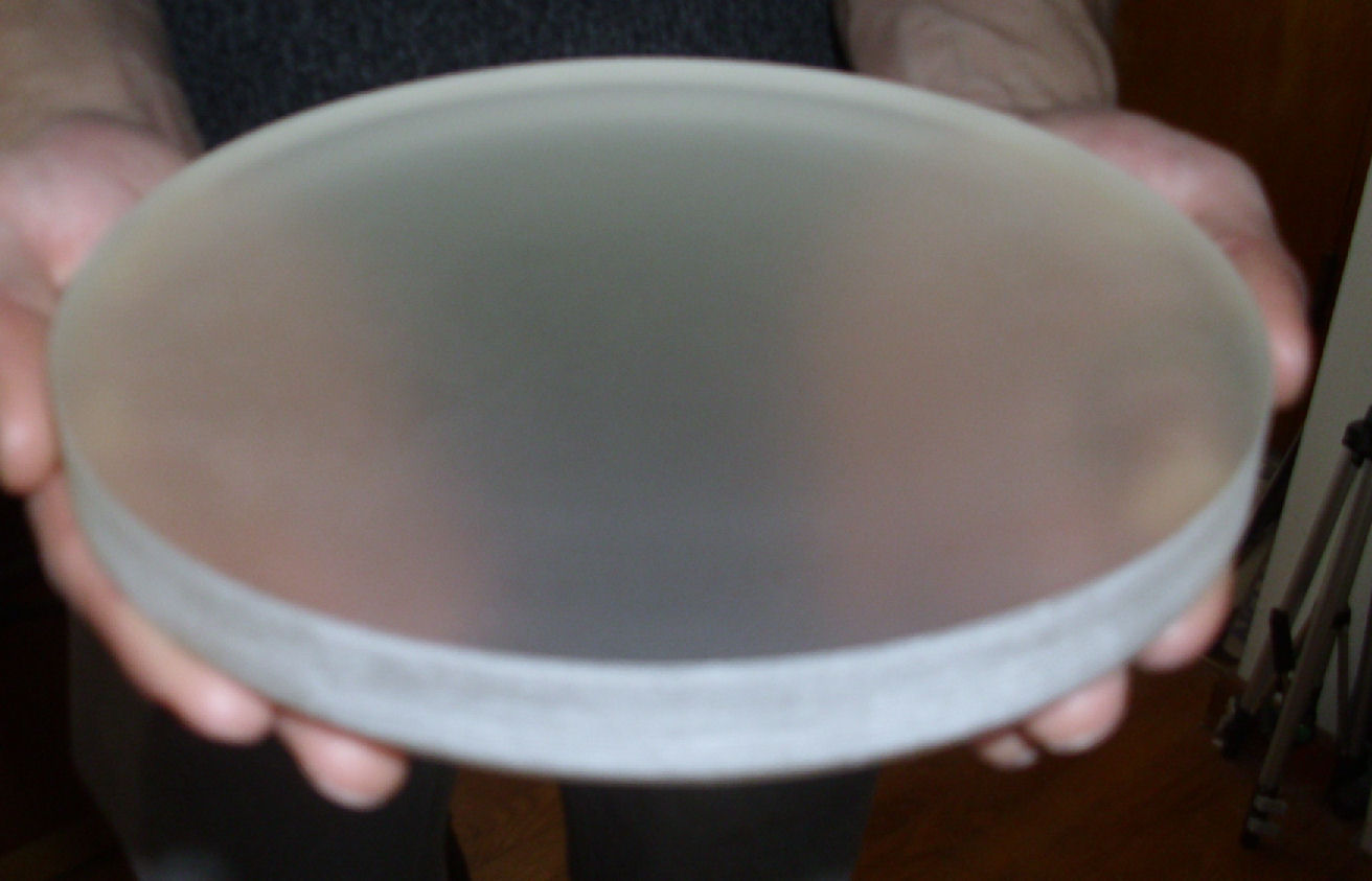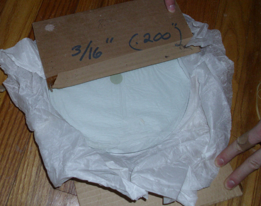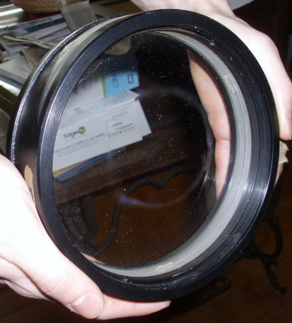 old 6" ground, black paint on back, polished f/5 aprox. Prob. Pyrex, has small chip