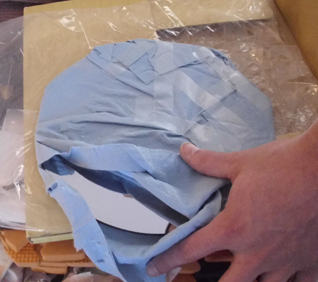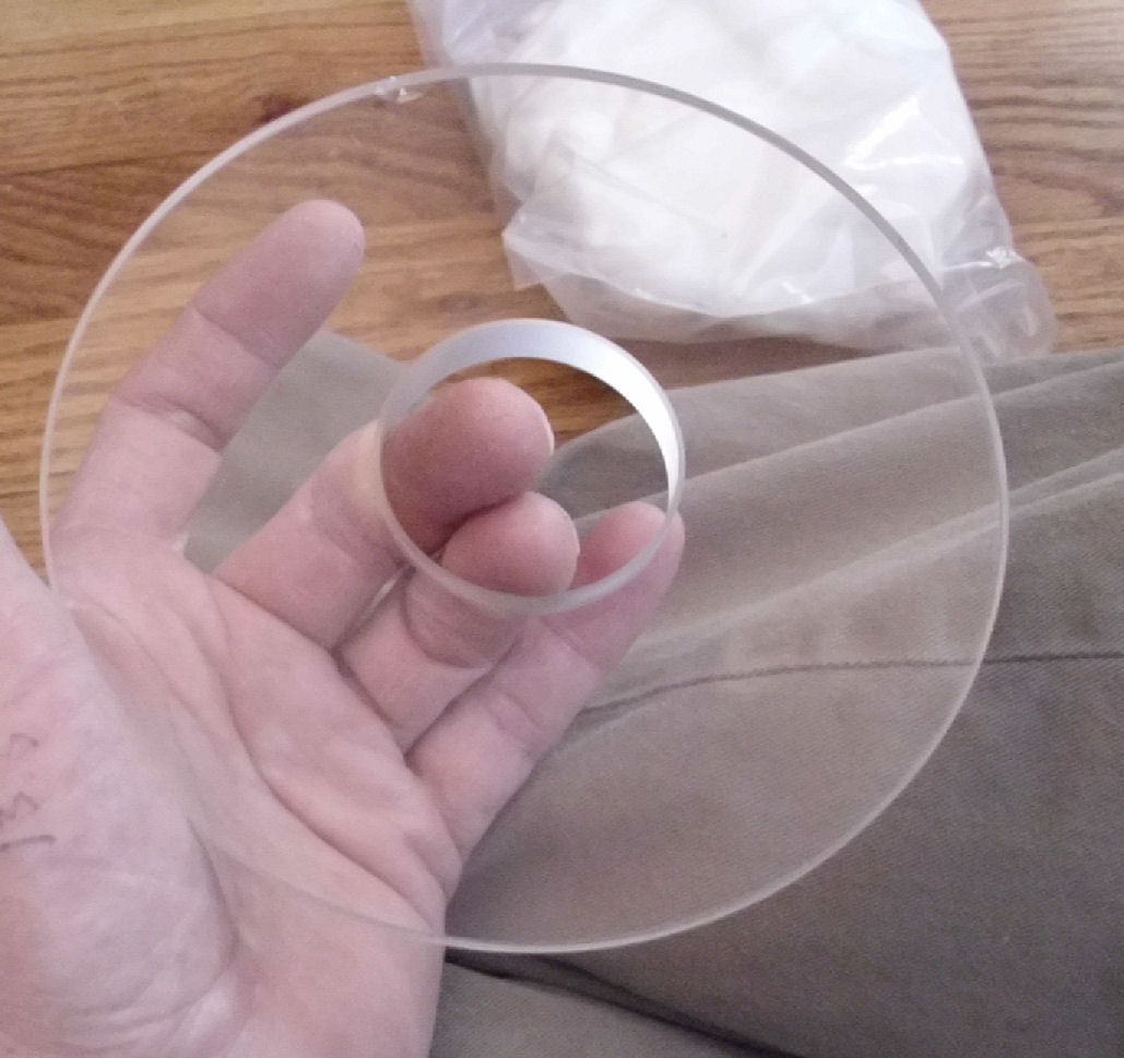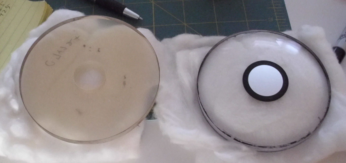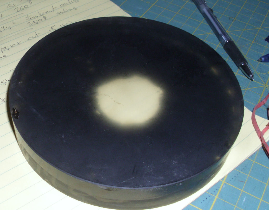 old 6" ground, black paint on back, polished f/5 aprox. Prob. Pyrex, has small chip