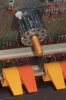 here's a side view of the reed mech. It reveals the glass reed switches. Inside the outer cylinder of reeds and plastic posts, there's an inner cylinder that rotates and holds a magnet. The magnet likely closes the reeds when its in close proximity.